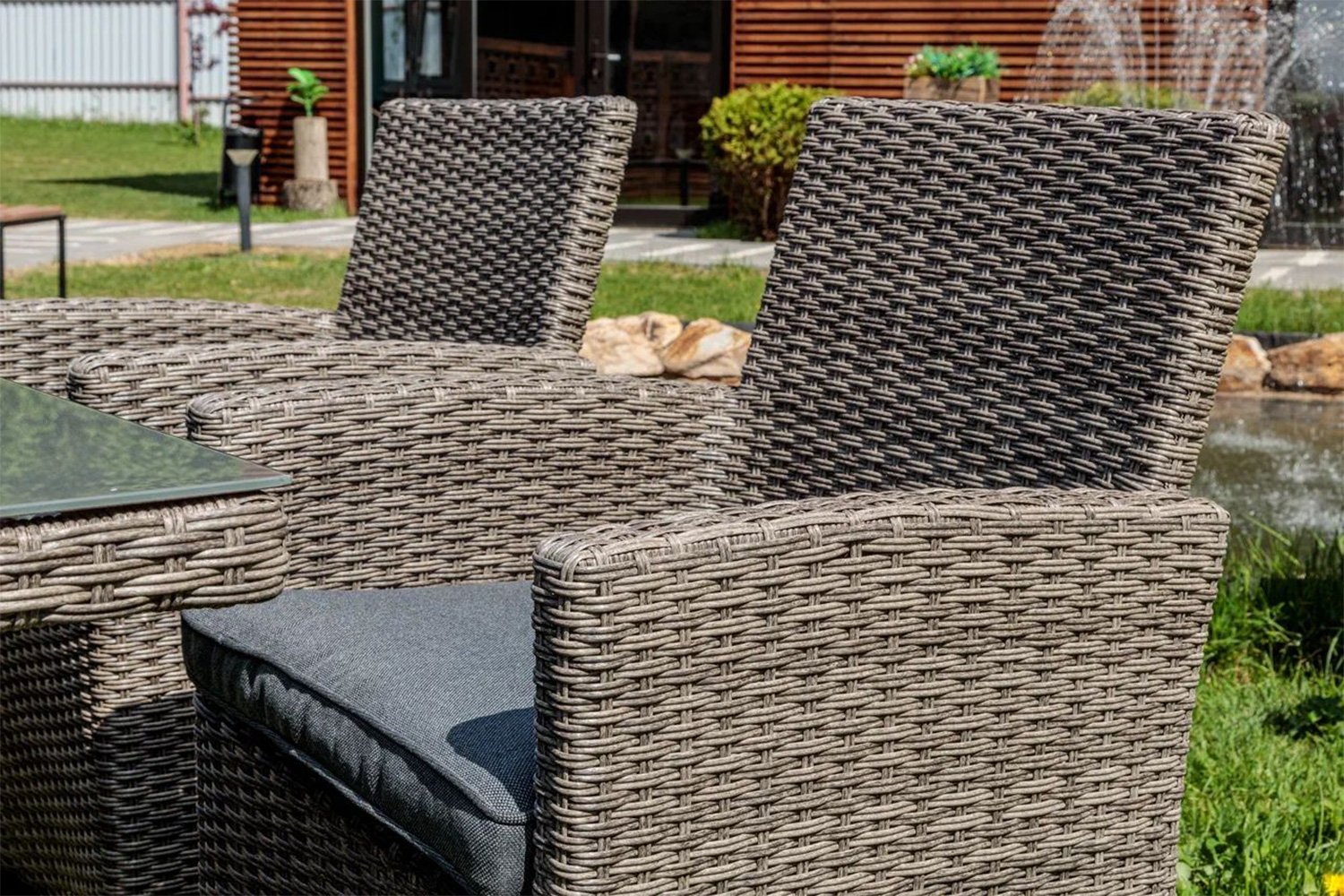 Серый цвет – универсальный оттенок для обустройства любого пространства. На природе, когда хочется наслаждаться только окружающей погодой, не хочется обставлять пространство отдыха яркими цветами, и серый комплект Фиона для этого отлично подойдет. В таком комплекте сможет разместиться до 6 взрослых людей, которые смогут насладиться полноценным обедом. В набор входят 6 кресел размером 58х89х60 см и просторный обеденный стол 160х74х90 см. такой набор может быть поставлен как на улице, так и в тепле помещения – дизайн и материалы отлично позволяют сделать это.