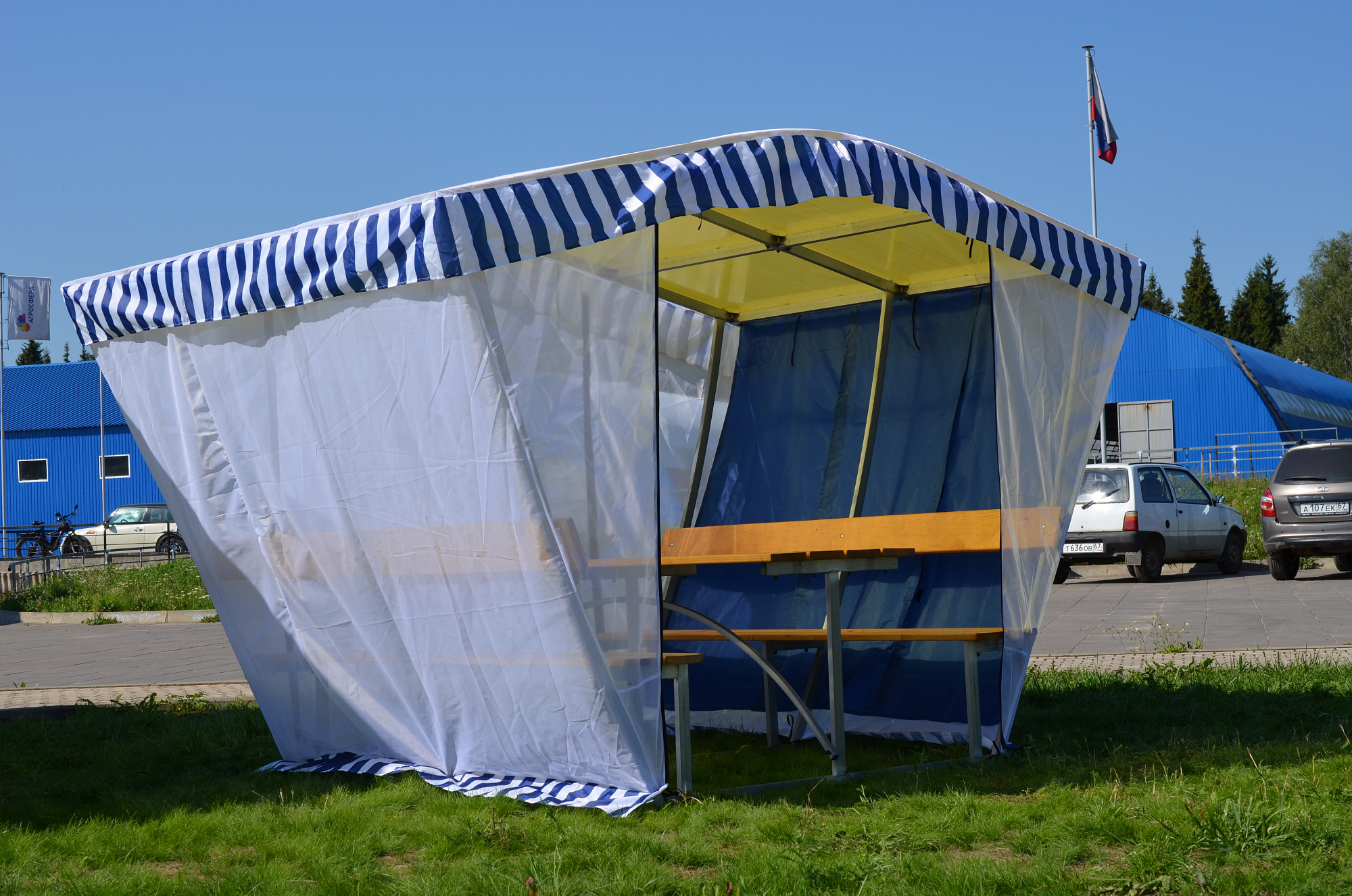 Устройство входных зон обеспечивает доступ с обоих торцов беседки и позволяет проветривать зону отдыха в жаркий день, в тоже время придавая ей легкое рассеянное затенение.