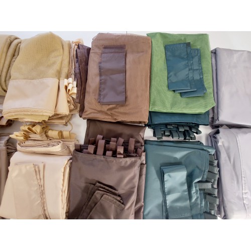 При оформлении заказа можно выбрать вид креплений – люверсы или липучки. Все шторы между собой могут быть соединены с помощью молнии. В комплекте товара присутствует 6 москитных штор, булавки и подвязки для крепления к беседке. При оформлении заказа можно выбрать разную толщину окантовки (от 210 до 600 ден), но это повлияет на цену.