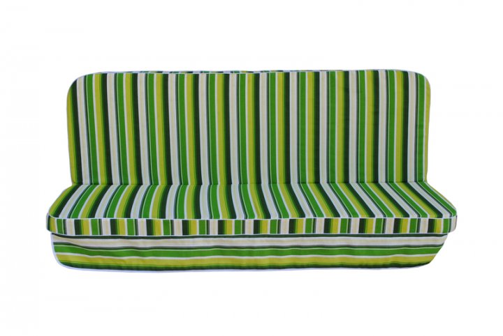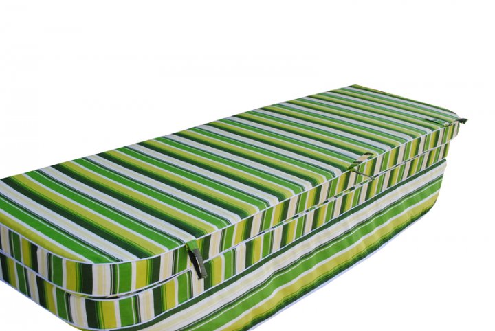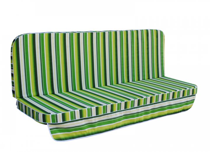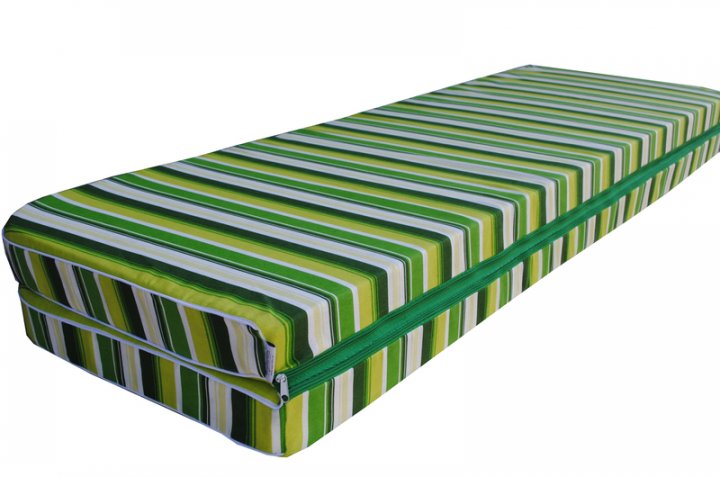 Данный матрас предназначен для садовой качели. Такие матрасы изготавливаются из универсальных тканей, изготовленных в Испании. Благодаря тому, что в такой ткани огромный процент натуральных волокон, она замечательно пропускает воздух, а также является максимально приятной на ощупь. Эта ткань устойчива к появлению пятен, она с лёгкостью разглаживается. Наполнитель изготовлен из пенополиуретана вторичного вспенивания. Спинка, а также сиденье матраса выполнены на молнии, поэтому наполнитель с лёгкостью можно вынуть, а чехол легко можно постирать. Для того, чтобы матрас надёжно держался на качели, на нём есть специальные завязки по бокам.